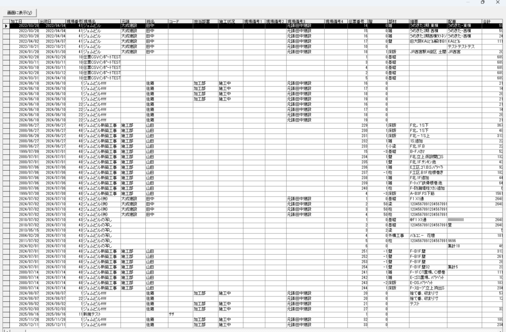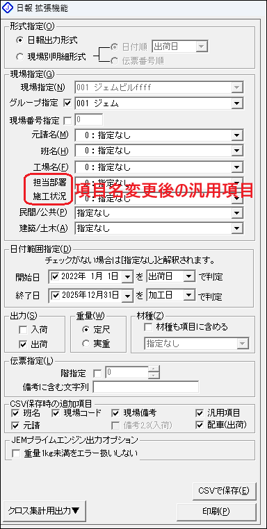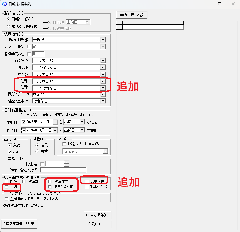 JEM鉄筋システム構成 日報拡張機能機能拡張&CSV出力の項目追加 2026.01.14 2026.02.18 CSV出力に以下の項目を追加しました ・汎用項目(汎用1、汎用2) ・現場備考(1~4) ・元請名 ・備考2、3(入荷のみ) その他、以下の点を機能拡張しております ・『汎用項目1、2』による抽出条件選択 ・日付範囲指定の詳細化 条件選択画面 画面に表示